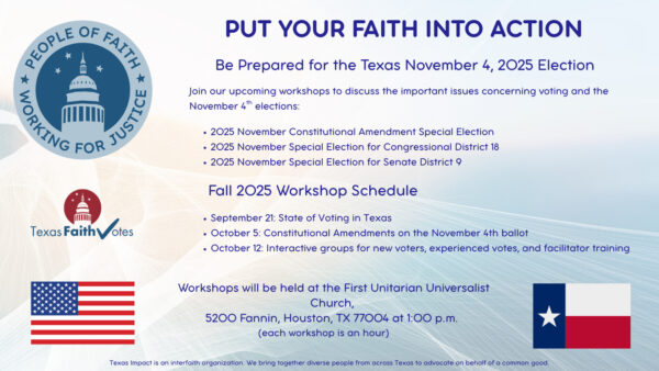 Texas Impact staff will be out and about for the next several weeks, speaking and teaching. You can find our upcoming public appearances on our Events page. Looking for a speaker for your event? Fill out our speaker request form to get started.