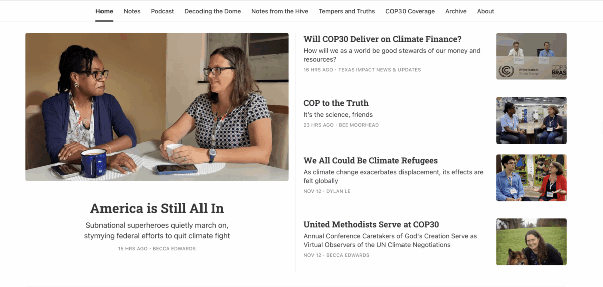 This week, Bee and the Texas Impact delegation are participating in the United Nations climate negotiations known as COP30 in Belém, Brazil. The news from the COP is coming quickly, so make sure you are following along on Texas Impact’s substack as well as through Texas Impact’s media partnerships with the Austin Chronicle, Baptist News Global, and United Methodist Insight. Reporting out from the climate negotiations is important to help inform people of faith on the climate crisis and opportunities to work for a more sustainable future, and we are grateful for our media partners for helping reach a broader audience.